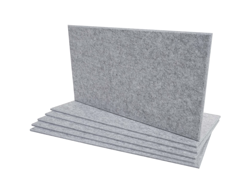 Conjunto de 6 painéis acústicos em tecido poliéster com fixação adesiva. Reduz ruídos, melhora a acústica e valoriza o ambiente.