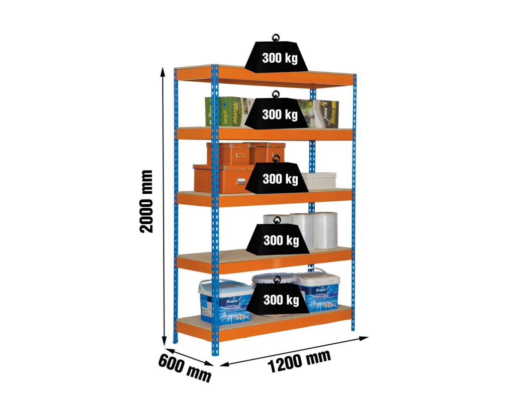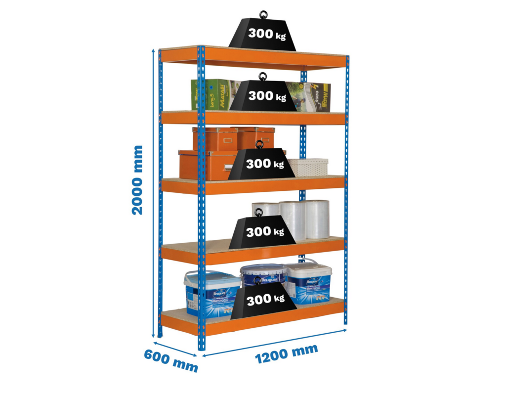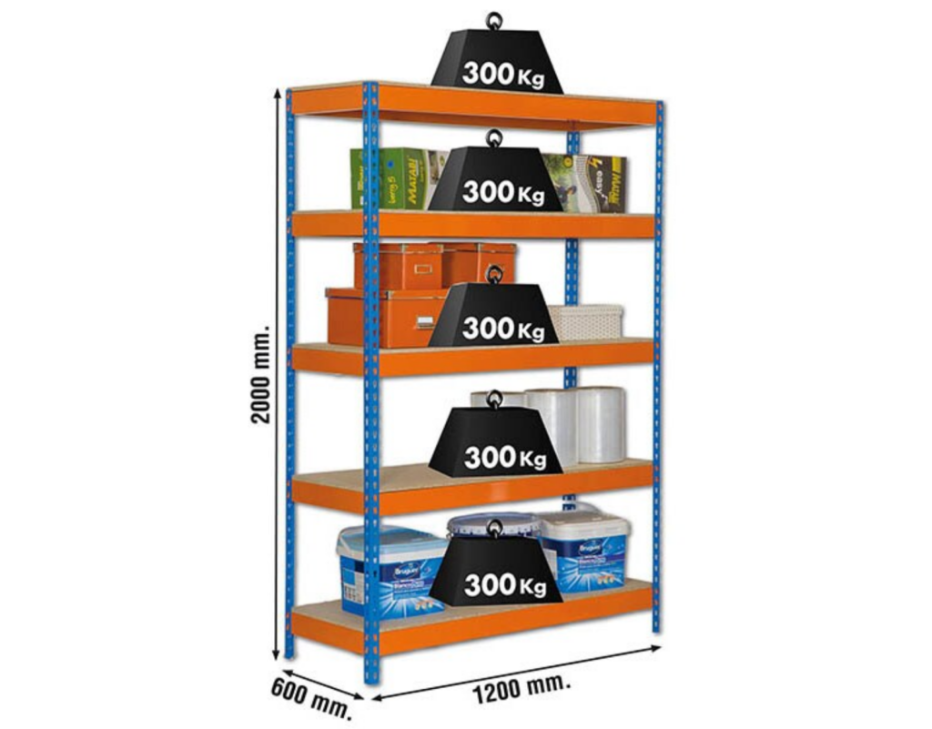 Fabricada com uma estrutura em aço reforçado e equipada com prateleiras em madeira aglomerada de 12 mm, esta estante suporta até 300 kg por nível, garantindo uma elevada capacidade de carga para armazenar ferramentas, equipamentos, caixas e objetos volumosos com total segurança.